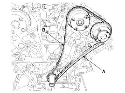 35. Remove the RH timing chain guide (A) and RH timing chain (B).