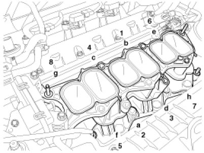 Tighten the intake manifold bolts and nuts, in several passes as below.