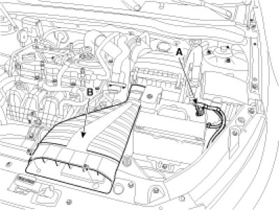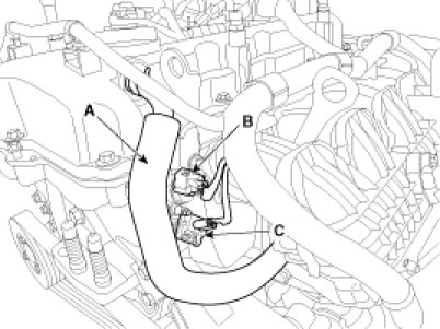 7. Disconnect the PCV hose (A), the intake OCV (Oil control valve) connector (B) and the OTS (Oil temperature sensor) connector (C)