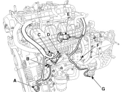 8. Disconnect the A/C compressor switch connector (A), the alternator connector (B), the OPS (Oil pressure switch) connector & injector extension connector (C), the knock sensor connector (D), the MAPS (Manifold absolute pressure sensor) & IATS (Intake air temperature sensor) connector (E), the ETC (Electronic throttle control) connector (F) and the vacuum pump connector (G).
