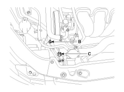 Recovery/Recycling/Charging System (A) to the high-pressure service port (B) and the low-pressure service port (C) as shown, following the equipment manufacturer's instructions.