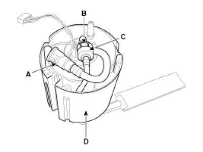 9. Remove the cap (B), and then remove the assist pump (C) and the fuel pressure regulator (D).