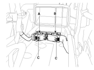 5. Pull up the lock (C), of the SRSCM connector, the disconnect the connector (A and B).
