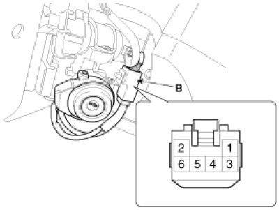 1. Disconnect the ignition switch connector (A) and key warning switch connector (B) from the steering column.