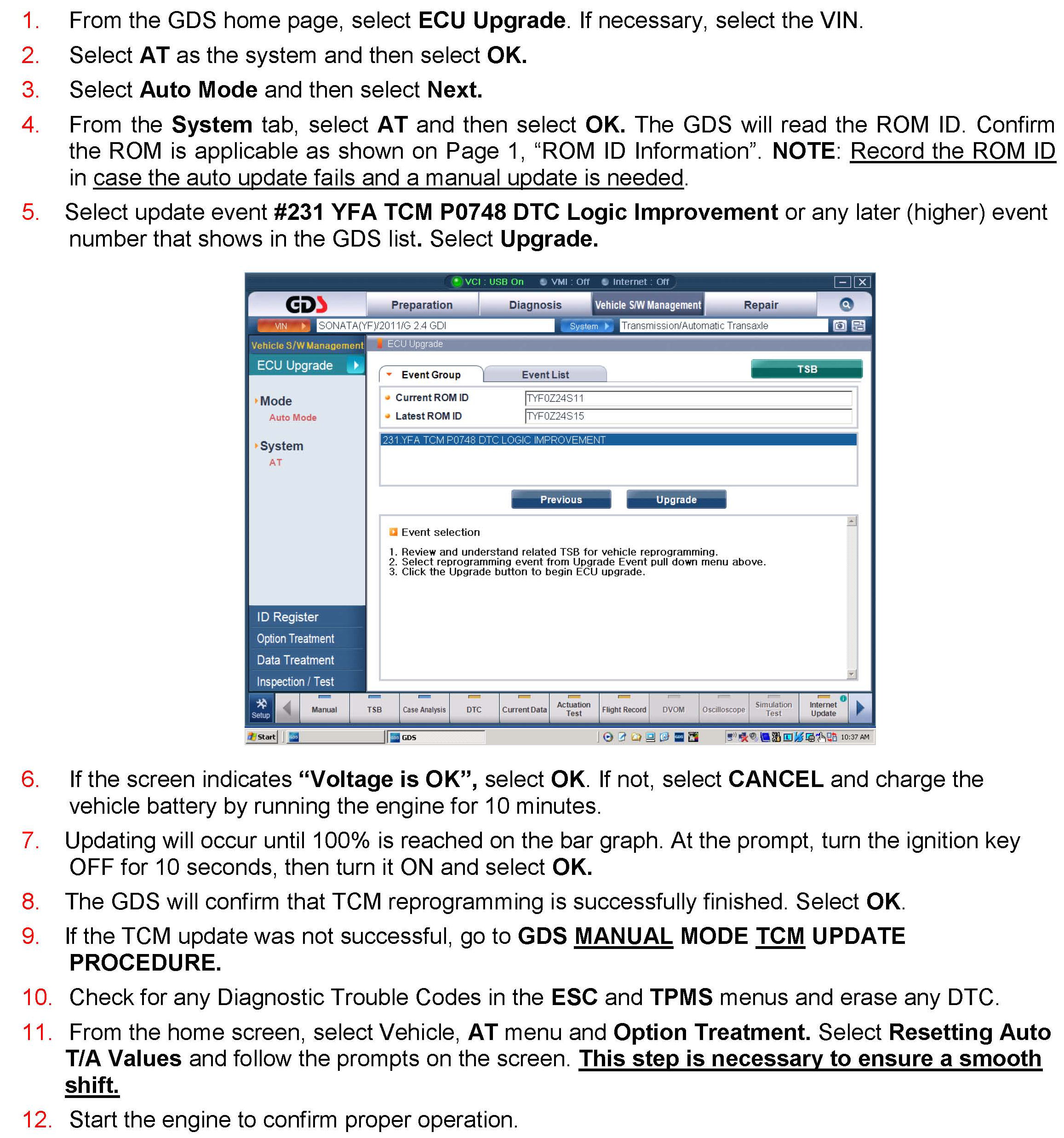 This bulletin provides a procedure to update the TCM for 2011 Sonata 2.0L and 2.4L (YFA) vehicles with revised logic for Diagnostic Trouble code P0748 (Pressure Control Solenoid Valve Circuit).