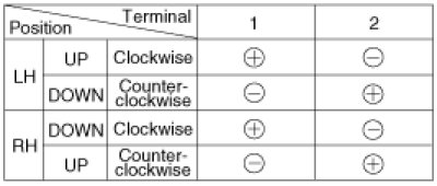3. Connect the motor terminals directly to battery voltage (12V) and check that the motor operates smoothly. Next, reverse the polarity and check that the motor operates smoothly in the reverse direction. If the operation is abnormal, replace the motor.
