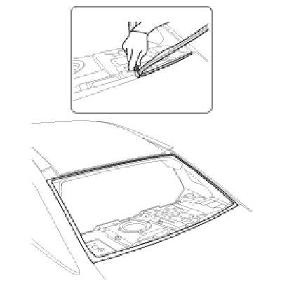 1. With a knife, scrape the old adhesive smooth to a thickness of about 2mm (0.08 in.) on the bonding surface around the entire rear window glass opening flange :