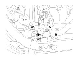 Recovery/Recycling/Charging System (A) to the high-pressure service port (B) and the low-pressure service port (C) as shown, following the equipment manufacturer's instructions.