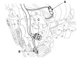 5. Disconnect the OPS (Oil pressure switch) connector (A), A/C compressor switch connector (B) and the HSG (Hybrid starter generator) sensor connector (C).