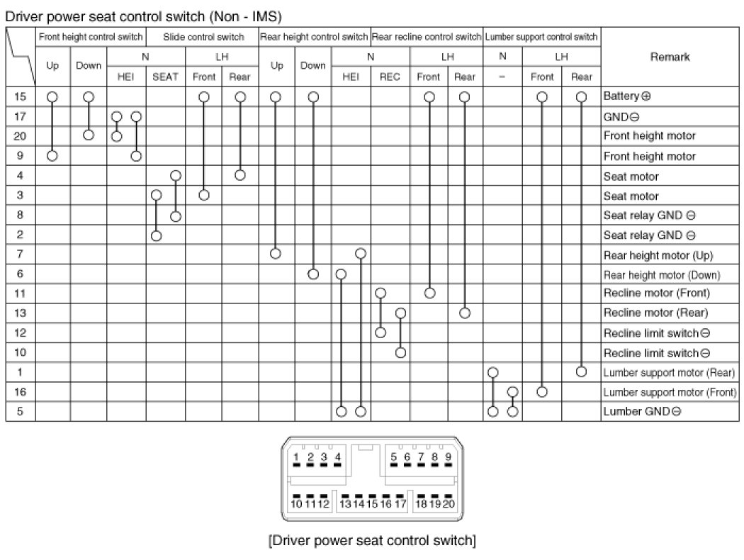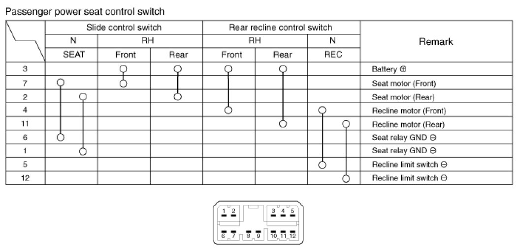 With the power seat switch in each position, make sure that continuity exists between the terminals below. If continuity is not as specified, replace the power seat switch.