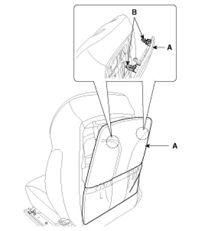 8. After removing the hogring clips (B) on the front of seat back and remove the seat back cover (A).