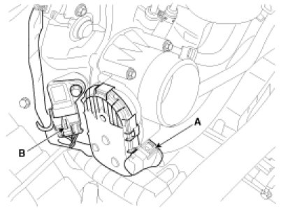 9. Disconnect the ETC (Electronic throttle control) connector (A) and MAPS (Manifold absolute pressure sensor) & IATS (Intake air temperature sensor) connector (B).