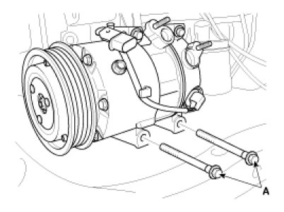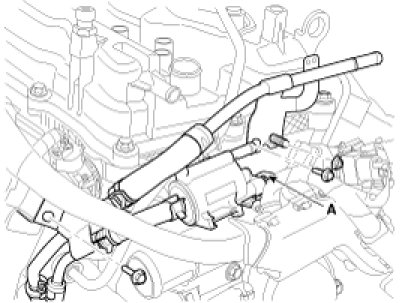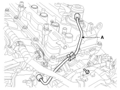25. Connect PCSV (Purge control solenoid valve) connector (A) and tighten the vacuum & PCSV (Purge control solenoid valve) pipe assembly mounting bolts and nut.