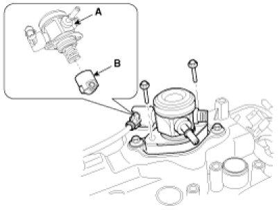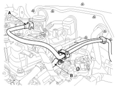 26. Connect the fuel hose (A) and PCSV (Purge control solenoid valve) hose (B).
