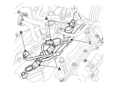 28. Connect the ignition coil connectors (A) and fuel pump connector (B) after installing the wiring protector (C).