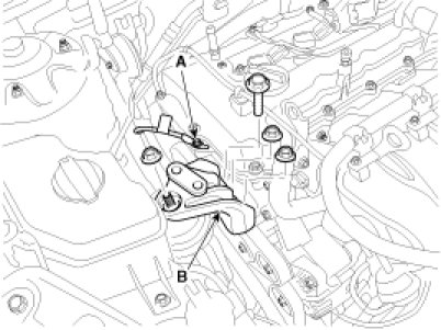 14. Install the engine mounting support bracket (B) and connect the ground line (A).