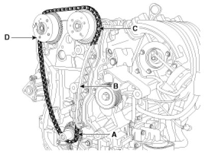 Crankshaft sprocket (A) -> Timing chain guide (B) -> Intake CVVT sprocket (C) -> Exhaust CVVT sprocket (D).