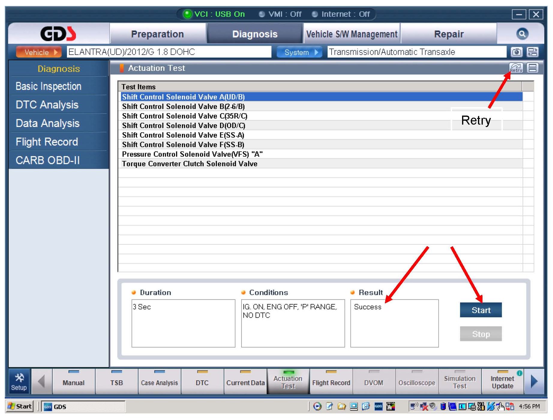^ "Failure" - The GDS did not request the TCM to activate the solenoids. Click on the "Retry" button on the top right of the screen. If "Failure" is displayed again, go to Step 4.