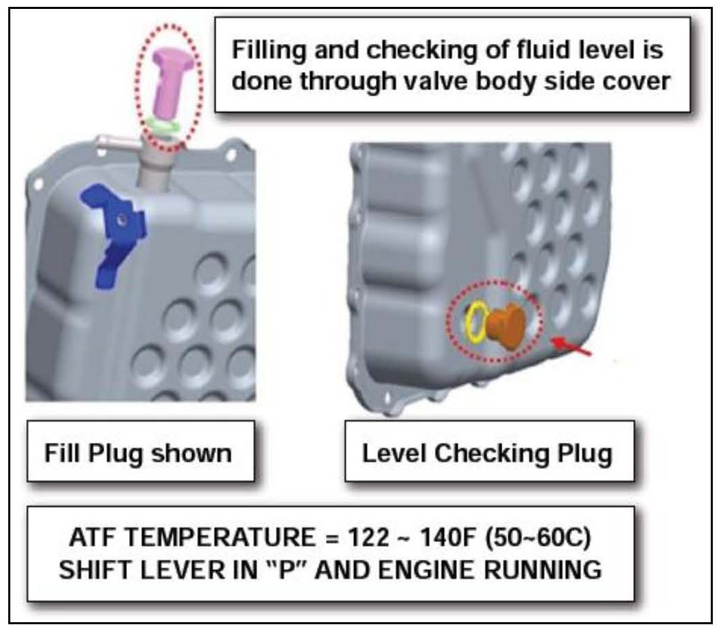 Start the engine and shift to Park. When the ATF is 122°F~140°F (50~60°C) remove the level checking plug. The level is correct when oil flows out of the level checking plug in a thin steady stream.
