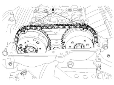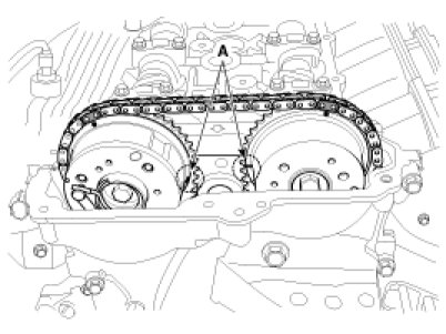 (2) Mark the timing chains (A) on the timing marks of the CVVT sprockets.
