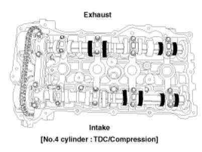 (2) Check that the TDC marks (A) of the CVVT sprockets are in straight line on the cylinder head surface as shown in the illustration.
