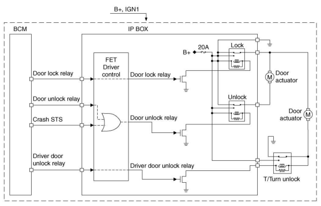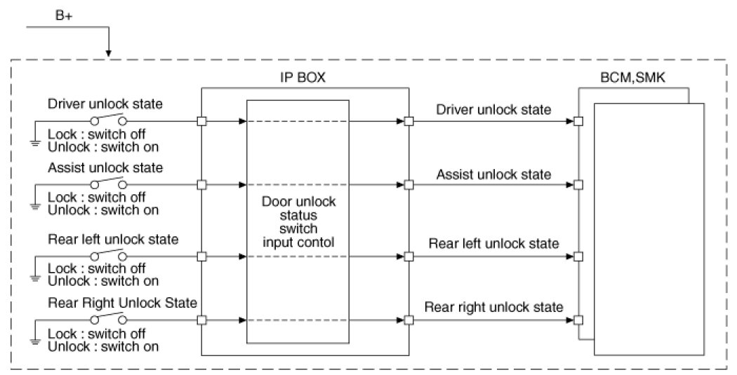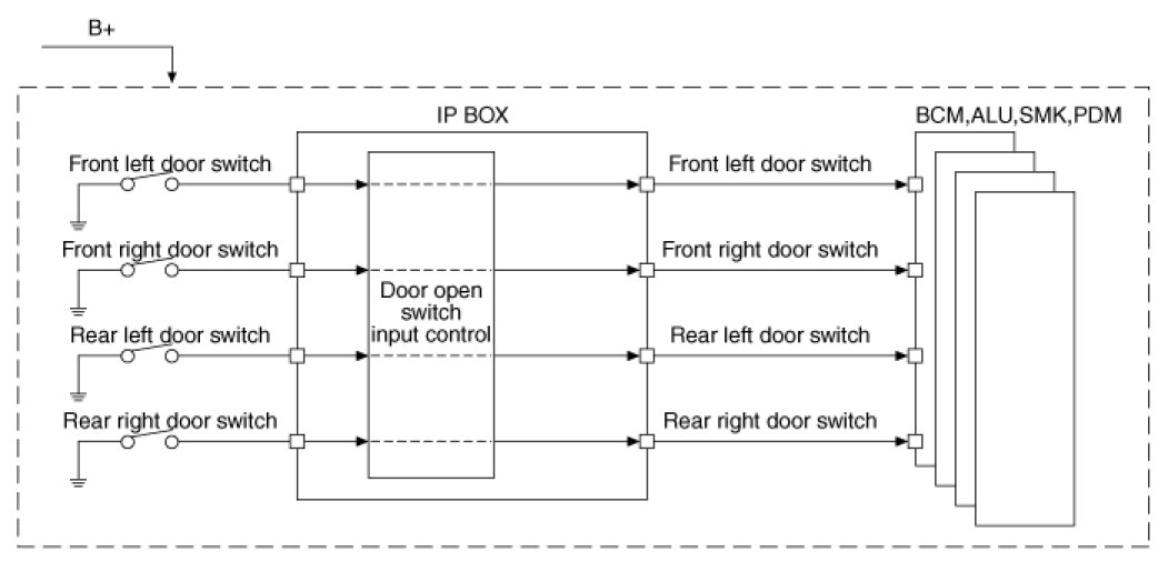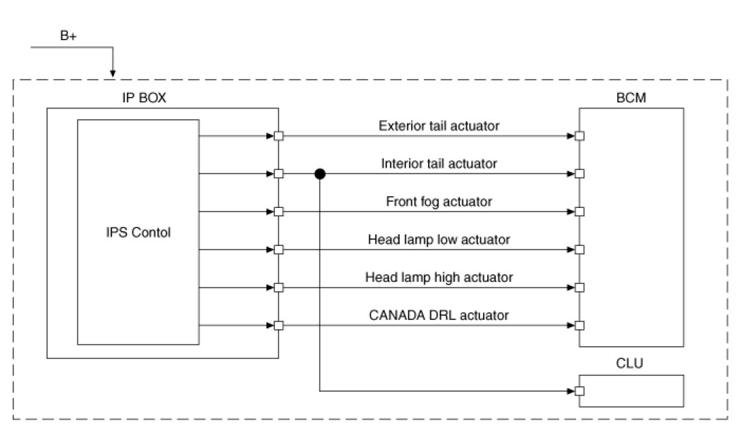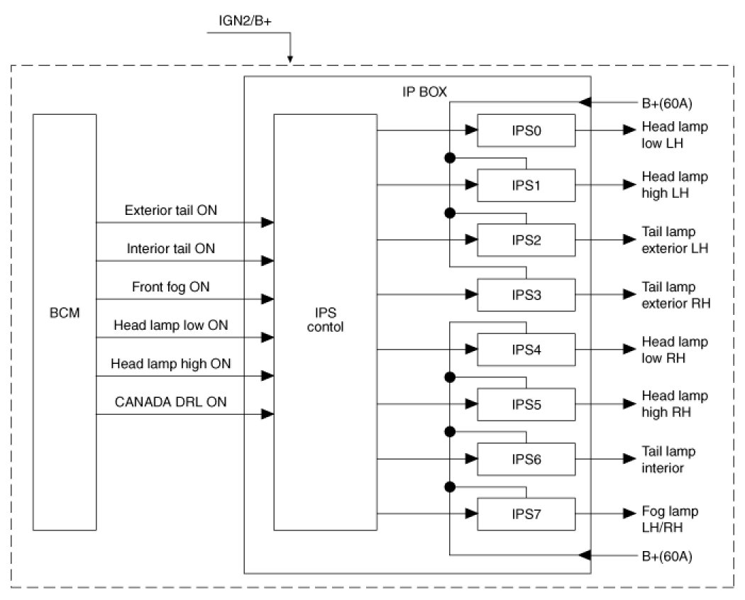 The BCM controls IPS and relay on the SJB. For example, if BCM requests head lamp low beam control, then BCM requests related lamp control at one time.