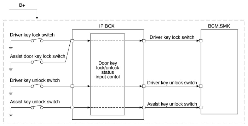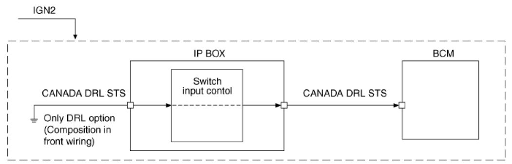 This chapter defines signal between SJB and peripheral electrical apparatus in the form of signal flow diagram. Control of the IPS and relay is required by BCM. Following figure expresses power source that is operating power condition