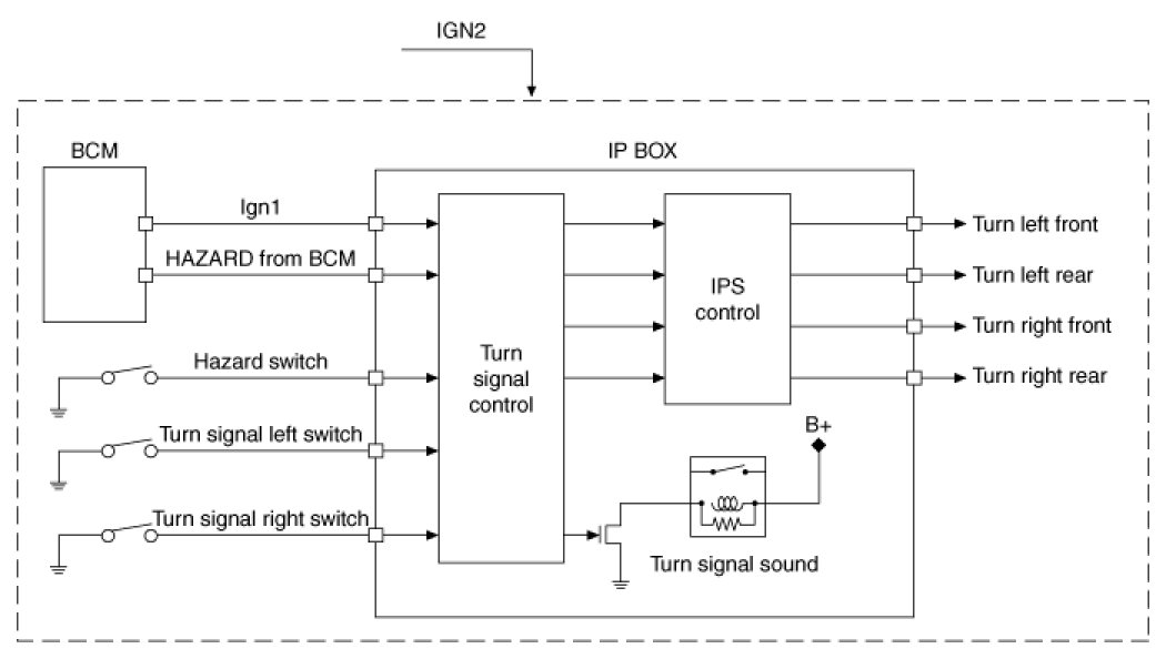 1. Turn Signal by ' Turn Signal LH switch' and ' Turn Signal RH switch' works during 'Ign1=ON' or ' IGN2=ON'.