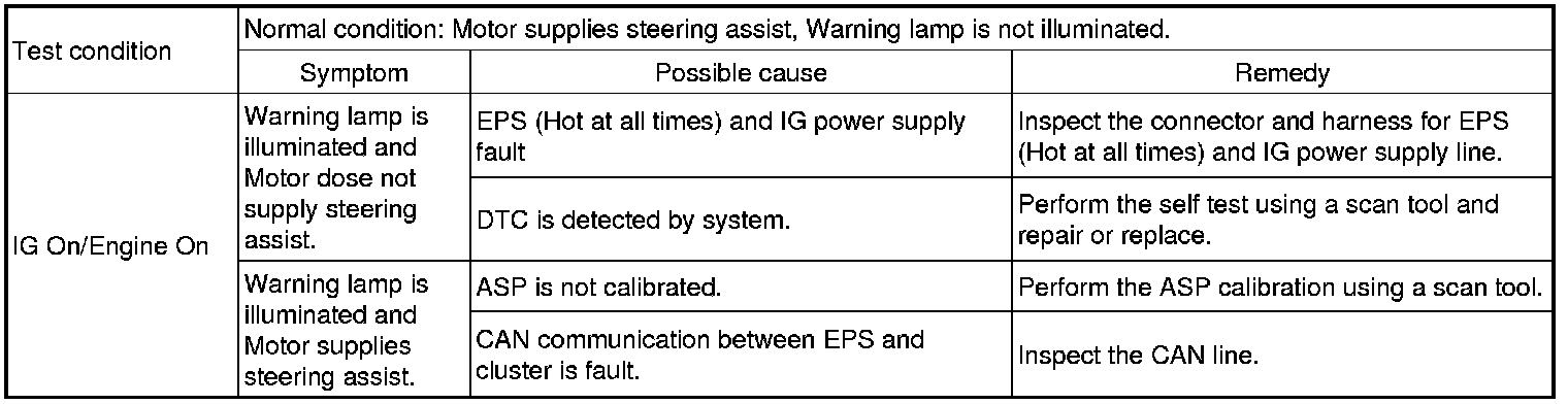 After or before servicing the EPS system, perform the troubleshooting and test procedure as follows. Compare the system condition with normal condition in the table below and if abnormal symptom is detected, perform necessary remedy and inspection.