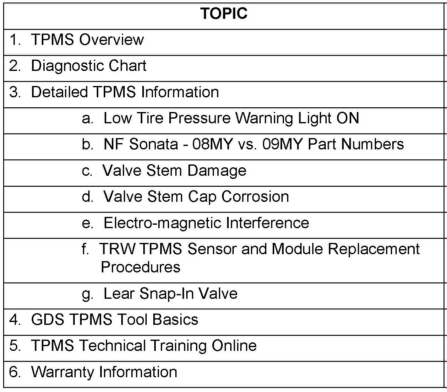 This TSB provides a general overview of TPMS systems, a diagnostic chart, GDS tool basic use instruction, and warranty policy.