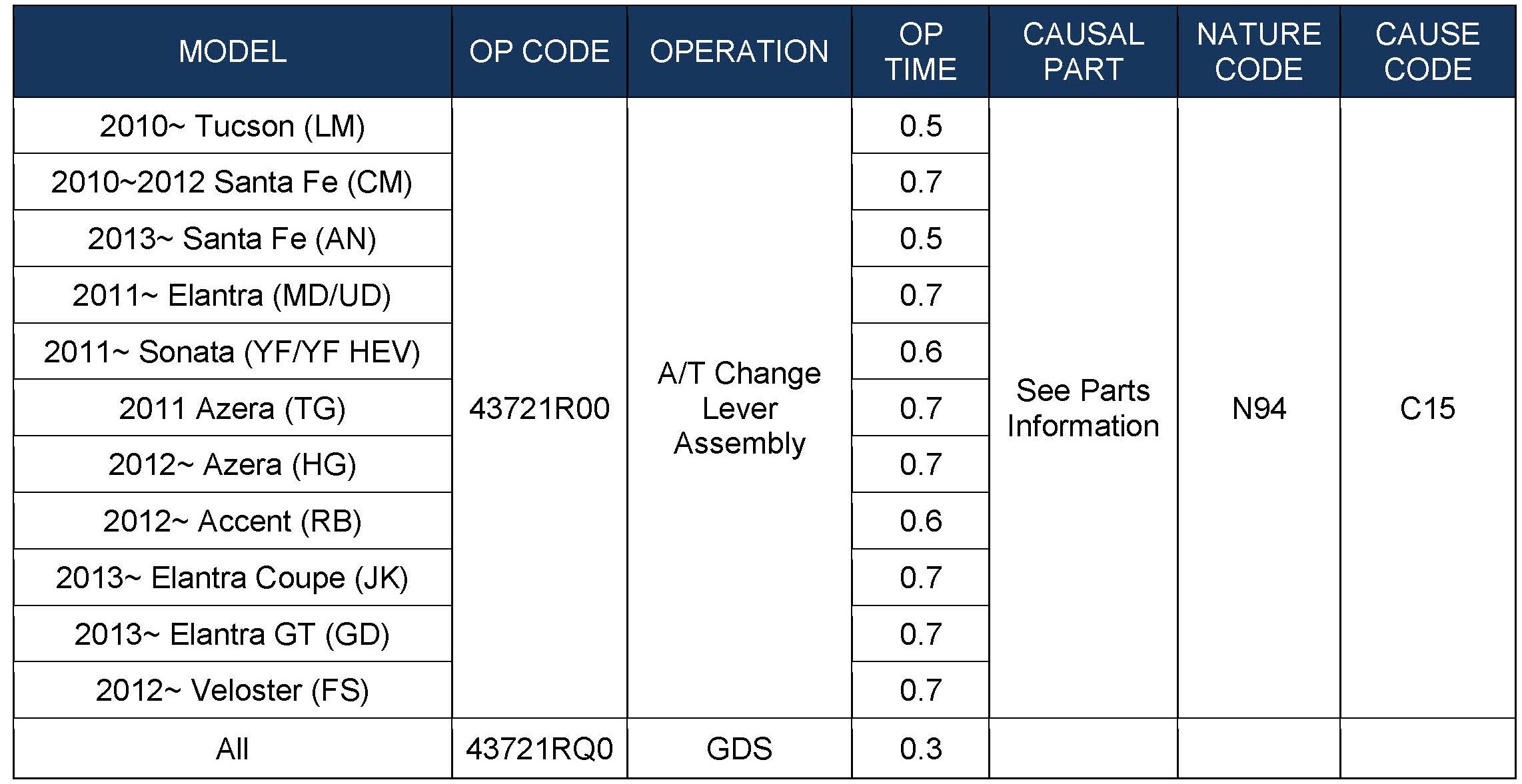 (UD/MD/GD/JK), Santa Fe (AN/CM), Sonata