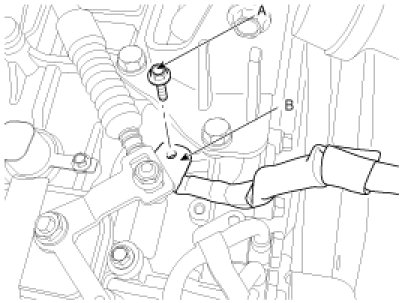 7. Remove the automatic transaxle upper mounting bolt (A-2ea) and the starter motor mounting bolt (B-2ea).