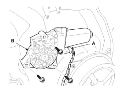 3. After loosening the mounting screws, then remove the power window motor (B).