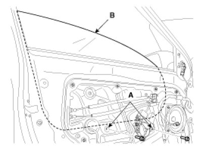4. Carefully adjust the glass (B) until you can see the bolts, then loosen them. Separate the glass from the glass run and carefully pull the glass out through the window slot.