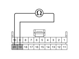 2. Measure the resistance between terminal (M01-A) 20 and 19 of the cluster harness side connector.