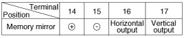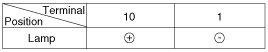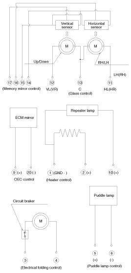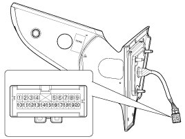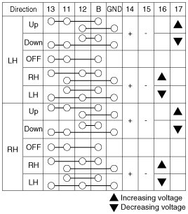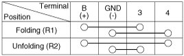 3. Apply battery voltage to each terminal as shown in the table and verify that the mirror operates properly.