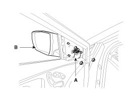 3. After loosening the mounting nuts, then remove the outside rear view mirror (B).