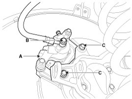 4. Loosen the hose eyebolt (B) and caliper mounting bolts (C), then remove the rear caliper assembly (A).