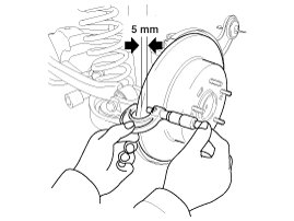 1. Place a dial gauge about 5mm (0.2 in.) from the outer circumference of the brake disc, and measure the runout of the disc.