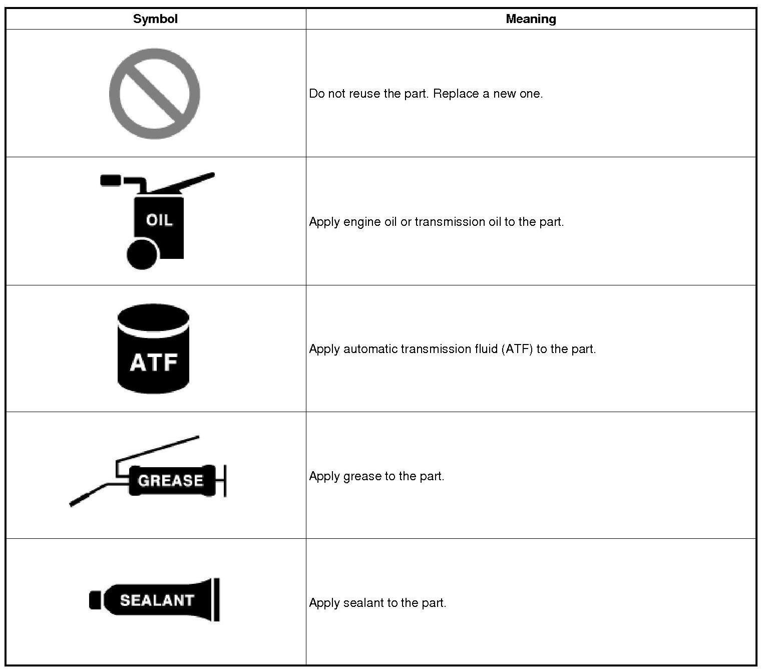 Basic Service SymbolsThere are five primary symbols used to complement illustrations. These symbols indicate the part to apply such materials during service.