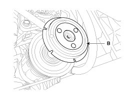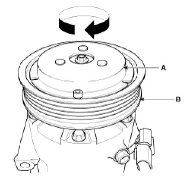 - Be careful not to damage the pulley (B) and compressor during removal/installation.