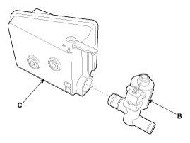 6. Release the lever (A), and then separate the canister close valve (B) from the fuel tank air filter (C) after rotating it in the direction of the arrow in the figure.