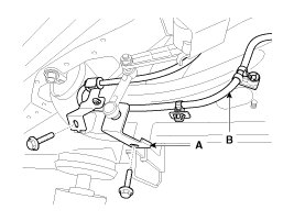 2. Loosen the bolts and then height sensor bracket (A) and brake cable (B).