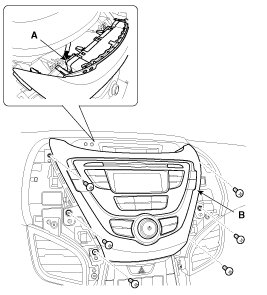 3. After leasing the mounting screws, disconnect the connector (A), and then remove the center fascia cover (B).