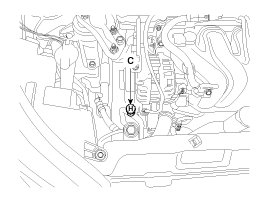 2. Connect an R-134a refrigerant Recovery/Recycling/Charging System (A) to the high-pressure service port (B) and the low-pressure service port (C) as shown, following the equipment manufacturer's instructions.