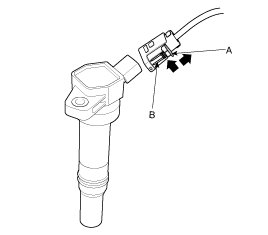 When removing the ignition coil connector, pull the lock pin (A) and push the clip (B).