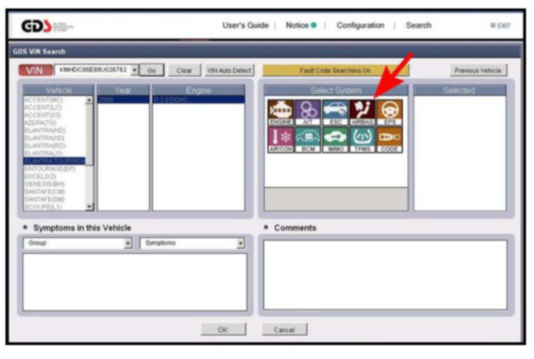 4. Press the "VIN Auto Detect" button to automatically read the vehicle's VIN (or manually enter vehicle, year, and engine if it does not automatically read this information), then select the "AIRBAG" system.