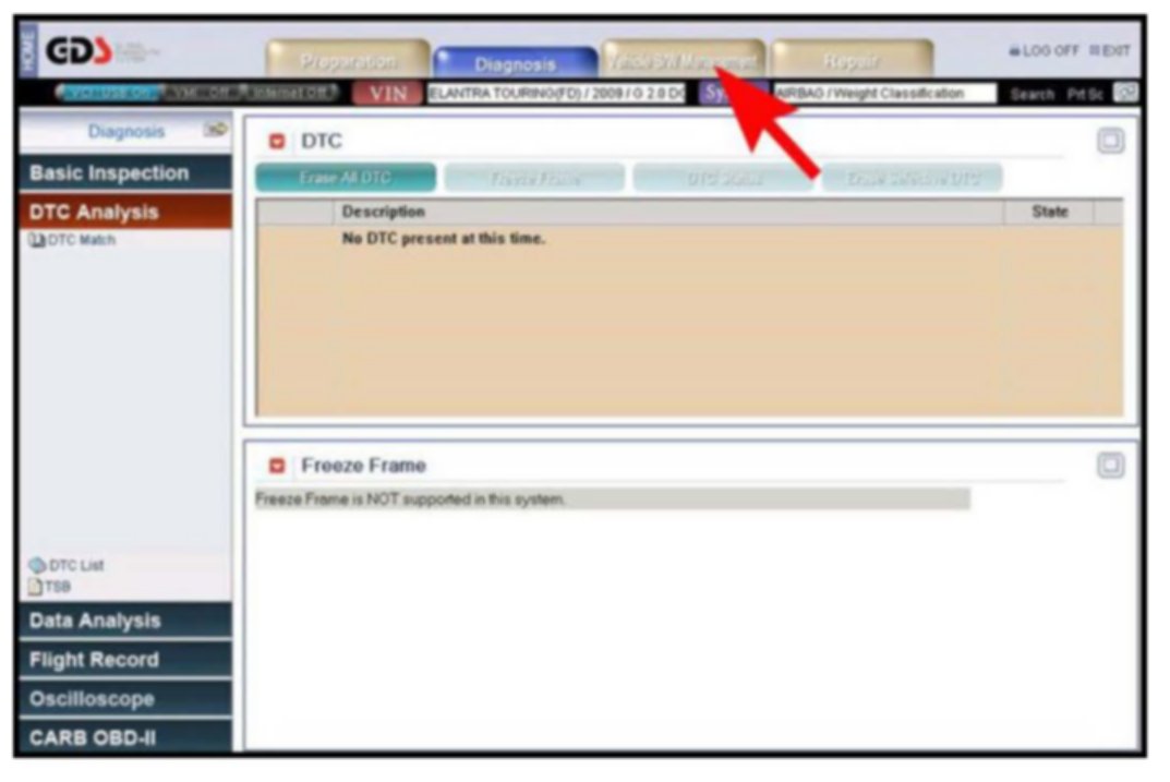 8. Press the "Vehicle S/W Management" tab on the GDS screen.