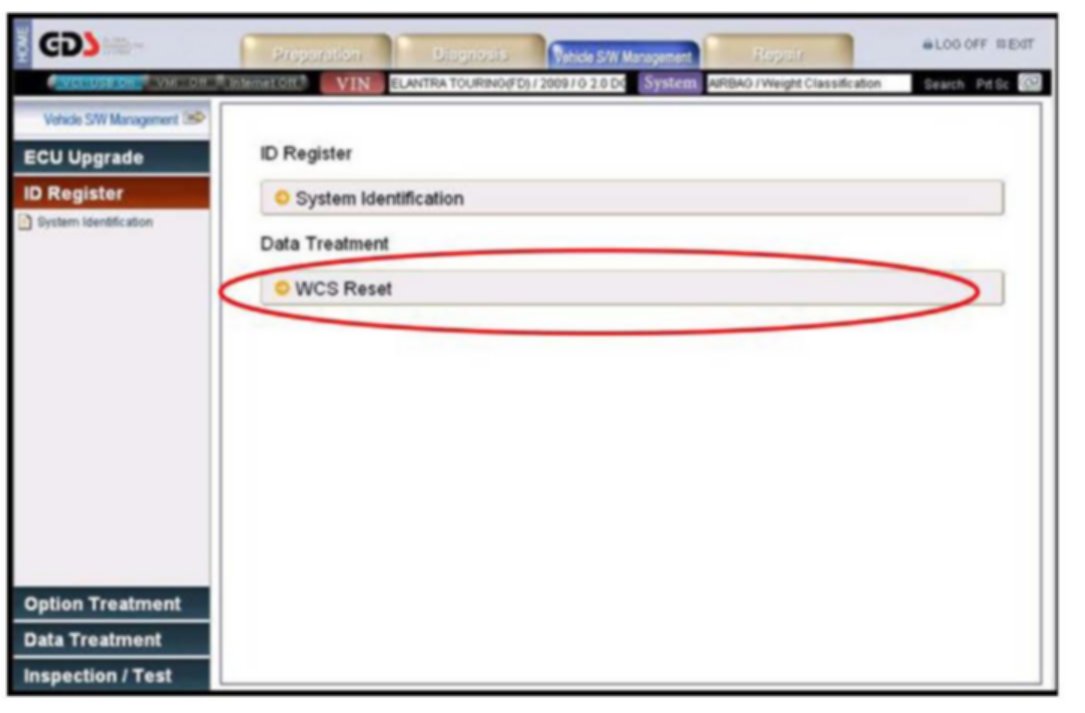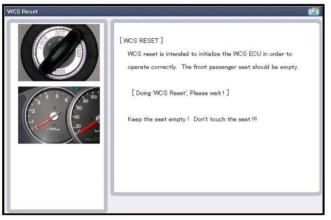 After replacement, the Occupant Classification Systems Electronic Control Unit (referred to as WCS [Weight Classification System] ECU on the GDS display screen) needs to be reset using the GDS tool. This reset procedure should be performed after replacing the front passenger seat cover, seat cushion pad, seat cushion assembly or seat track assembly.