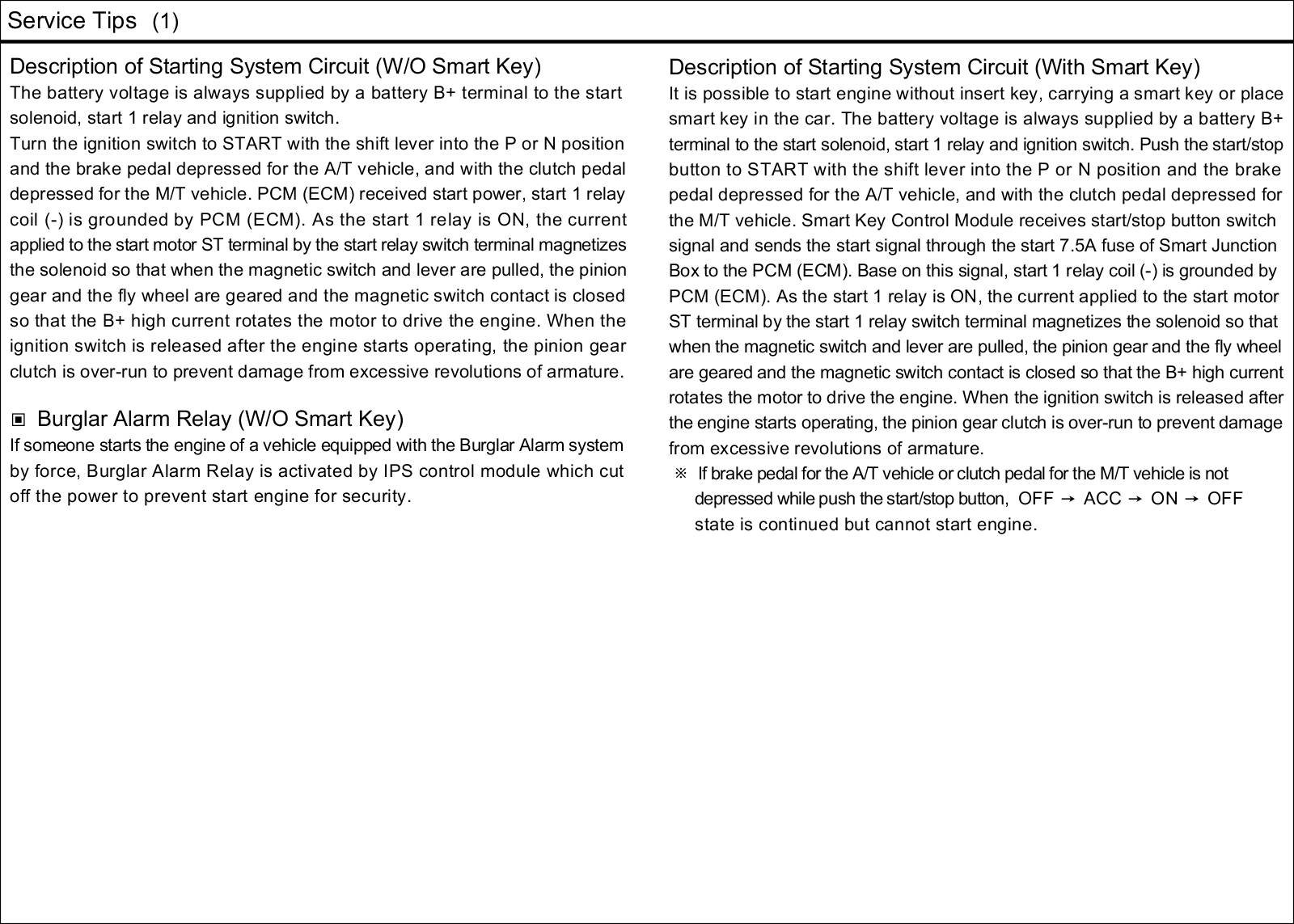 The starting system includes the battery, starter, solenoid switch, ignition switch, inhibitor switch (A/T), ignition lock switch, connection wires and the battery cable.